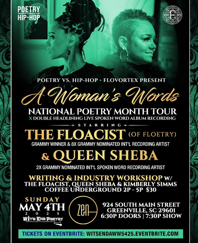Special Event May 4th! The Floacist (of Floetry) comes to Greenville! Buy tickets on Eventbrite or at our box office on Sunday nights.